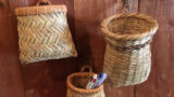 根曲竹のもぎかご 2025.11.20 雪の重みに耐えて育つ根曲竹。竹の子は地元の皆さんの心待ちだそうです。しなやかな強さのある根曲竹は、多くの生活用具に使われてまいりました。大きなもぎかごは、りんごの収穫に計りの役目も果たしていたそう。使いやすいもの便利なもの用途に合ったもの、から生まれる形。